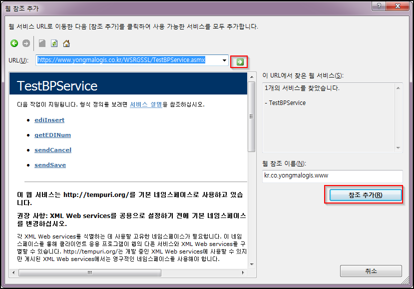 웹 참조 추가 창이 나타나면, 업체에서 (매뉴얼상에) 알려준 asmx URL을 입력하고 우측의 작은 화살표를 클릭 하면
