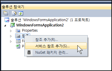 우선 Visual Studio 에서 새로운 프로젝트를 시작하고, 솔루션 탐색기에서 서비스참조 추가를 합니다.