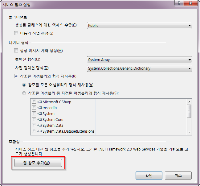 하단의 『고급』 버튼을 눌러서 서비스 참조 설정 창이 뜨면 다시 『웹 참조 추가』 버튼을 누릅니다.