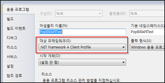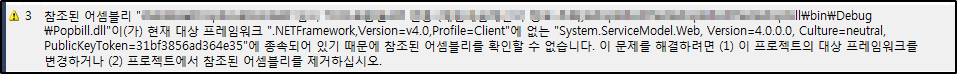 참조된 어셈블리 "Popbill.dll"이(가) 현재 대상 프레임워크 ".NETFramework,Version=v4.0,Profile=Client"에 없는 "System.ServiceModel.Web, Version=4.0.0.0, Culture=neutral, PublicKeyToken=31bf3856ad364e35"에 종속되어 있기 때문에 참조된 어셈블리를 확인할 수 없습니다. 이 문제를 해결하려면 (1) 이 프로젝트의 대상 프레임워크를 변경하거나 (2) 프로젝트에서 참조된 어셈블리를 제거하십시오.