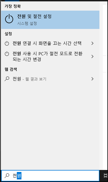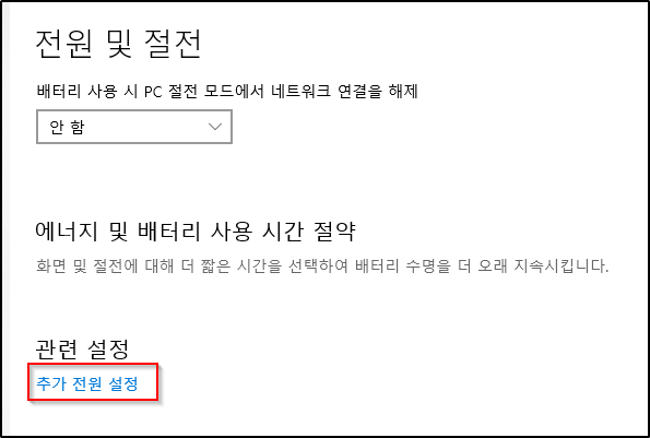 다음으로 시작 메뉴 검색창에서 '전원'을 입력하여 '전원 및 절전 설정'을 선택하고 다시 '추가 전원 설정'을 선택합니다.
