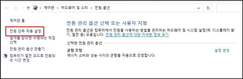 제어판의 전원 옵션 창이 뜨면 '전원 단추 작동 설정'을 선택합니다.