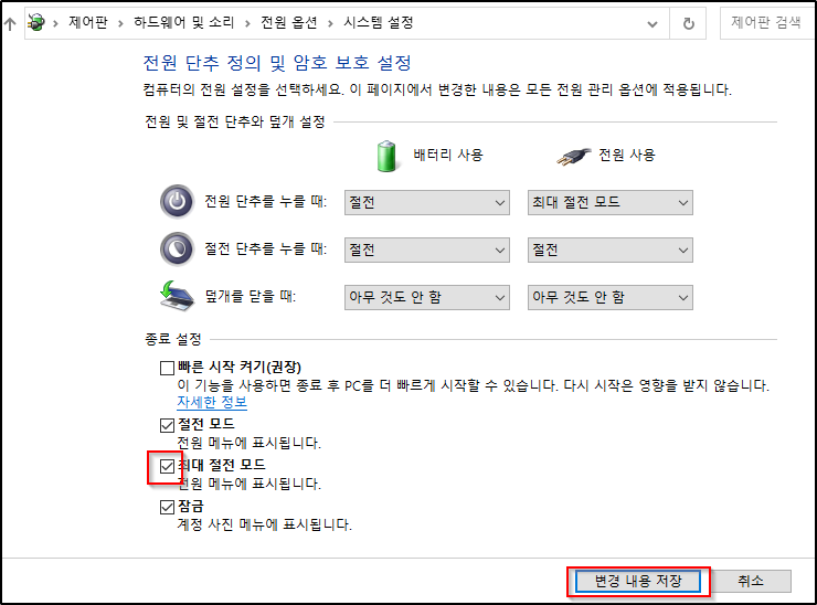 종료 설정 옵션 하위의 '최대 절전 모드'를 선택(체크)하고 저장 버튼을 누릅니다.