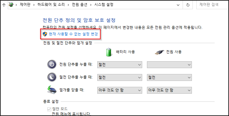 이어지는 화면에서 '현재 사용할 수 없는 설정 변경'을 선택합니다.