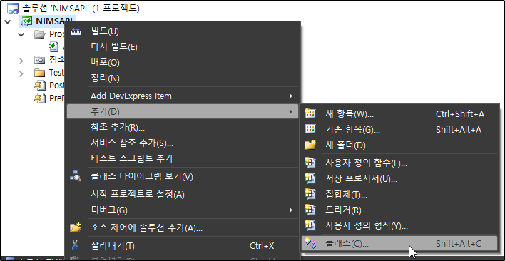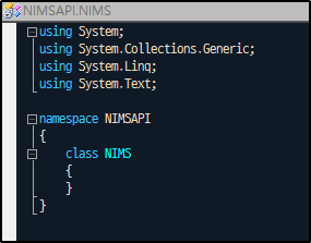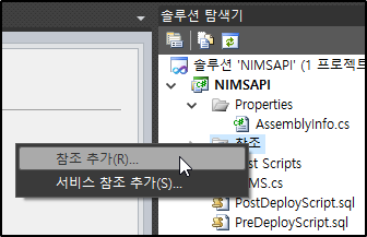 이제 실제 로직을 C#으로 구현하기 위하여 새로운 클래스 파일을 추가합니다 (이름은 NIMS.cs로 하였습니다).