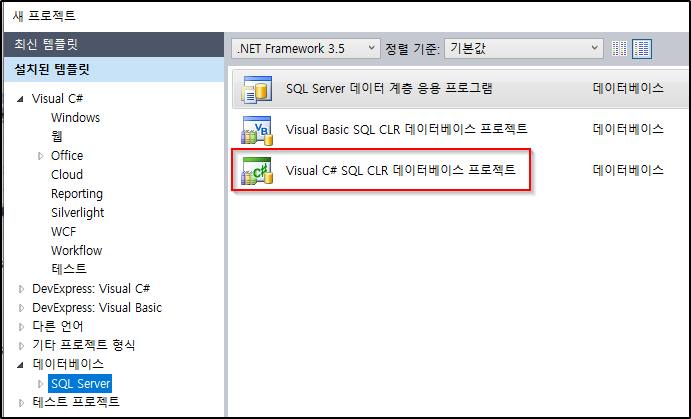 우선 Visual Studio에서 다음과 같이 SQL Server > Visual C# SQL CLR 데이터베이스 프로젝트를 시작합니다.