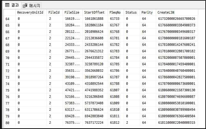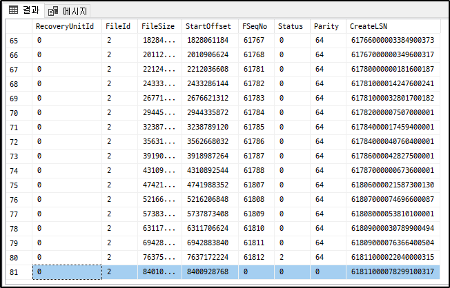 DBCC loginfo로 로그파일의 VLF(가상 로그 파일)를 확인해 보면 81개로 구성되어 있음을 알 수 있습니다.