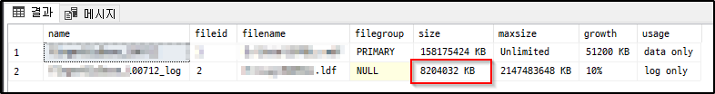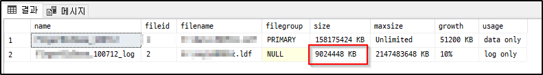 sp_helpfile로 확인해 보면 현재 로그파일 크기가 9,024,448 KB로 나타납니다 (운영 중인 DB라 가렸습니다).