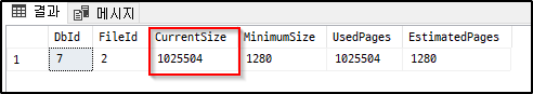 위에서 CurrentSize는 줄어든 후 로그파일의 페이지 수를 나타냅니다. SQL 서버에서 한 페이지는 8KB 이므로 KB로 변경하면 1,025,504 * 8 = 8,204,032 가 됩니다.