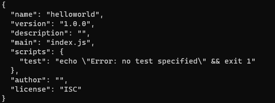 cmd(terminal) 창에서 임의의 작업용 폴더를 생성하고 해당 폴더로 이동 후 npm init를 하면 초기 상태의 package.json 파일이 생성됩니다 (나오는 질문에 모두 enter를 치면 default value로 답변되어 작성됩니다).