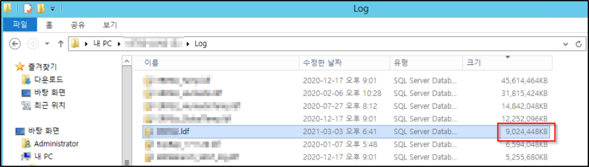 sp_helpfile로 확인해 보면 현재 로그파일 크기가 9,024,448 KB로 나타납니다 (운영 중인 DB라 가렸습니다).