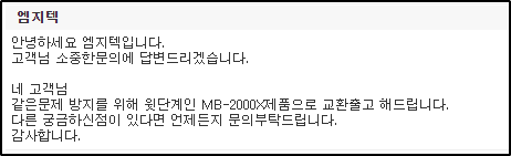엠지텍 제품의 부실함을 이곳에 포스팅 하고 엠지텍 Q&A 게시판에도 리콜 요청의 글을 두 차례 올렸습니다. 두번째 게시물을 올린 당일 관리자 댓글이 달렸습니다.