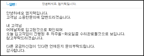 그런데 택배 보낸지 3일이 되도 따로 안내가 없어서 다시 문의 해보니 다음 주까지 수리가 된다고 답변이 달렸습니다.