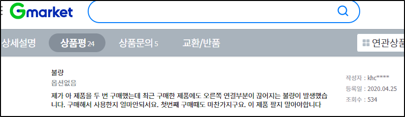 이후 구매했던 쇼핑몰의 상품평을 살펴 봤습니다. 놀랍게도 저만 문제가 있는게 아니었습니다. 많은 구매자들이 동일한 문제를 겪고 있었습니다. 제품 자체의 불량임에 틀림이 없었습니다.