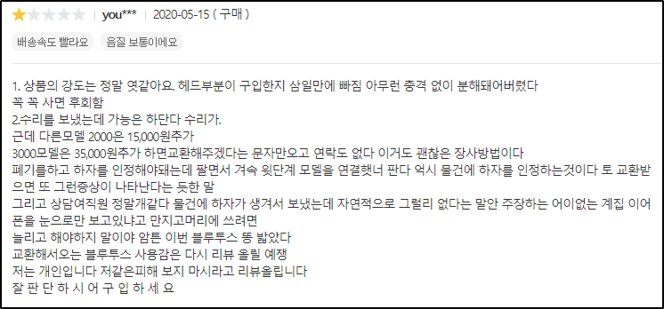 특히 마지막 구매자 사례는 저와 완전 복사판이라고 할 정도로 상황이 똑같습니다. 일단 저질 불량 제품을 팔아 놓고