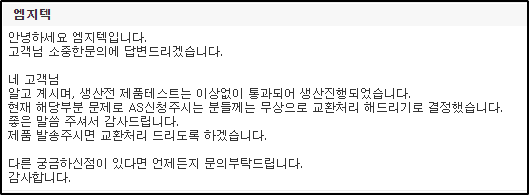 그러나 교체한 제품에서도 언제든지 동일 문제가 또 발생할 수 있으므로 결함이 확실히 없는 생산품으로 교체 해달라고 하니 다시 답변이 달렸습니다.