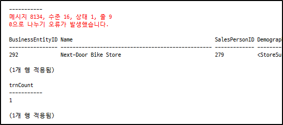 ② 에서 0 나누기 오류가 발생하자 그 이후의 쿼리는 수행되지 않고 트랜잭션이 종료되고 자동으로 롤백이 됩니다.