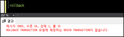 만약 이 상태에서 CATCH 내에서 ROLLBACK이 아닌 COMMIT을 시도하게 되면 다음과 같은 오류가 발생 합니다.